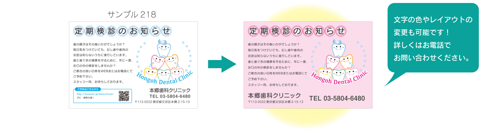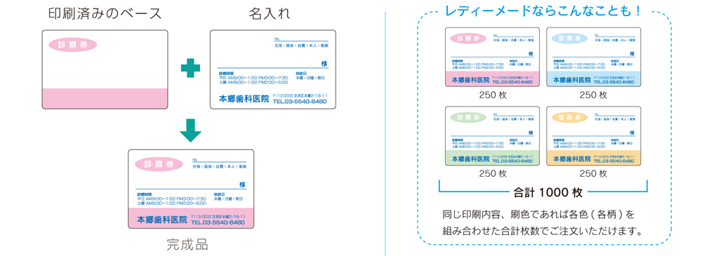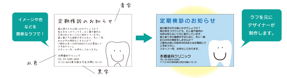 よくある質問 Q:iメンバーズとは何ですか? iメンバーズにご登録いただきますと割引が適用されます。詳しくはこちらをご確認ください。 Q:オーダーメードとレディーメードって何が違うの? ●ラフ等の参考資料から作成●ラフ等の参考資料から作成ロゴマークをご使用される場合は、メールでデータをいただくか、印刷物をご郵送ください。既に印刷されているベースに名入れをする診察券です。名入れ部分のレイアウトをアレンジしたり文字の大きさを変更することも可能です。 既に印刷されている部分を変更することはできませんのであらかじめご了承ください。 Q:医院のロゴをいれることはできますか? ロゴのデータをデータ受付専用メール宛にお送りください。データをご用意いただけない場合は、ロゴが記載されているチラシ等をお送りいただければスキャンして作成いたします。 ※レディーメード商品の場合、ロゴは一色となります。 Q:校正の方法はどのようなものがあるのですか? 主にFAX、メール等で行います。 色味の確認が必要な場合は郵送で原稿をお送りいたします。 ※レディメードに関しては、色味の確認ができませんのでご了承ください。 Q:カタログに載っていない色で印刷することはできますか? 可能です。詳しくはお問い合わせください。 Q:以前カタログに載っていたデザインで作成することはできますか? 可能です。詳しくはお問い合わせください。 Q:リコールカードに入れる地図は作成して貰えますか? チラシやパンフレット等でお使いの地図などがありましたら、FAXやメールでお送りください。また、手書きのラフ等を元に作成も可能です。 Q:領収書、納品書が入っていないです。 <領収書> 商品の受領時にお渡ししている送り状(伝票)の控えが領収書となります。 <納品書> 商品とは別にお送り致します。ご利用の際はお申し付けください。 Q:変更箇所があるけど修正費用はかかりますか? 修正費用は一切かかりません。ご安心ください。 Q:担当者が変わり、注文方法や履歴が知りたいです。 ご注文内容の確認や新しいご注文は、以下の方法で承っております。 <ご注文方法> ホームページ、FAX注文用紙、またはお電話にてご注文いただけます。 <ご注文履歴のご確認方法> 2023年以降にホームページからご注文いただいた場合は、マイページの「購入履歴」よりご確認いただけます。 それ以前のご注文につきましては、お手数ですがお電話にてお問い合わせください。 お問い合わせ先:0120-82-5540