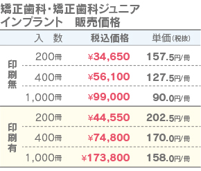 ガイドブック【矯正歯科・矯正歯科ジュニア・インプラント】 010048 ◆ご注文方法 印刷をご希望の場合は、名入れ印刷例を参考に、またはご自由に印刷内容をご指示ください。 名入れ印刷色をご指示ください。 ◆ガイドブック 裏面への名入れ印刷 裏全面に医院様情報などを入れることができます。印刷をご希望の場合は下記のサンプルを参考にご覧ください。またはご自由に希望内容をご指示ください。 注文数 200 400 1,000 名入れ印刷 無 有 矯正歯科 ーー 50枚 100枚 150枚 200枚 250枚 300枚 350枚 400枚 450枚 500枚 600枚 700枚 800枚 900枚 1,000枚 矯正歯科ジュニア ーー 50枚 100枚 150枚 200枚 250枚 300枚 350枚 400枚 450枚 500枚 600枚 700枚 800枚 900枚 1,000枚 インプラント ーー 50枚 100枚 150枚 200枚 250枚 300枚 350枚 400枚 450枚 500枚 600枚 700枚 800枚 900枚 1,000枚 名入れ印刷色(名入れ印刷有の場合のみ選択) ーー 前回同様 クロ コン 濃グリーン アカ コゲ茶 濃グレー グレー ブルー グリーン ムラサキ 名入れレイアウト(名入れ印刷有の場合のみ選択) ーー 前回同様 L1 L2 L3 L4 その他ご要望 在庫状態 : 在庫有り ¥34,650(税込) 只今お取扱い出来ません 数量