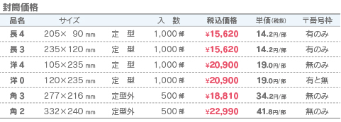 封筒 010050 ◆ご注文方法 用紙カラーは、10色からお選びください。封筒サイズは長型・洋型・角型各2サイズから1つお選びください。 デザイン例を参考、または自由にご希望内容をご指示ください。あわせて名入れ印刷色をご指示ください。 ※洋4封筒の「スカイ」「アクア」「グリーン」「ウグイス」「クリーム」「ベージュ」は廃盤となりました。 ※印刷の都合上、封筒の全編に10mmの余白が必要となります。あらかじめご了承ください。 封筒サイズ 長4 1,000部 長3 1,000部 洋4 1,000部 洋0 1,000部 角3 500部 角2 500部 カラー 選択してください 前回同様 ピンク クリーム ブルー ウグイス ベージュ スカイ アクア グリーン グレー ホワイト 名入れ印刷色 選択してください クロ コン 濃グリーン アカ グレー 濃グレー ブルー グリーン ムラサキ コゲ茶 名入れ印刷面 選択してください 表面(宛名面) 裏面 前回同様 レイアウト選択 選択してください 前回同様 サンプル2(角型) サンプル3(角型) サンプル5(角型) サンプル2(長型) サンプル3(長型) サンプル4(長型) サンプル5(長型) サンプル6(長型) サンプル7(長型) サンプル1(洋型) サンプル2(洋型) サンプル3(洋型) サンプル6(洋型) サンプル8(洋型) サンプル9(洋型) その他ご要望(洋0封筒ご注文の方は郵便番号枠の有無を記入してください) 在庫状態 : 在庫有り ¥15,620(税込) 只今お取扱い出来ません 数量
