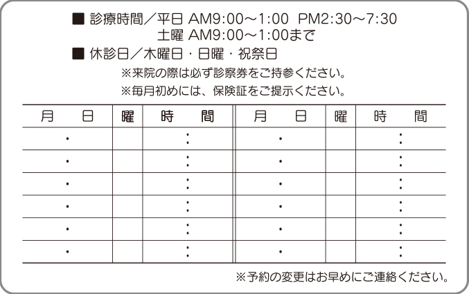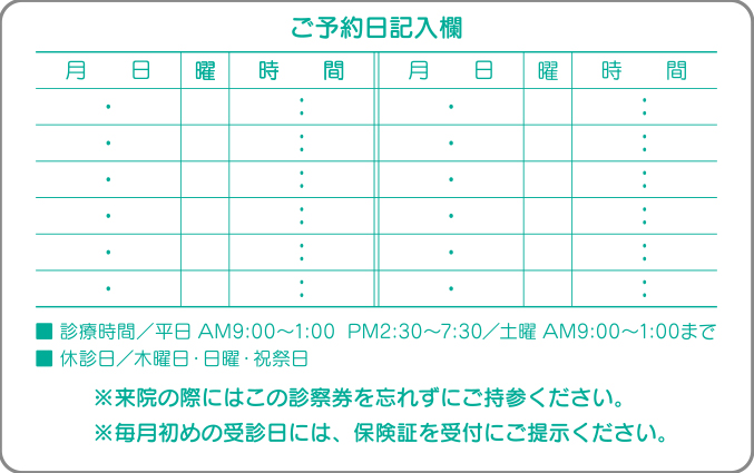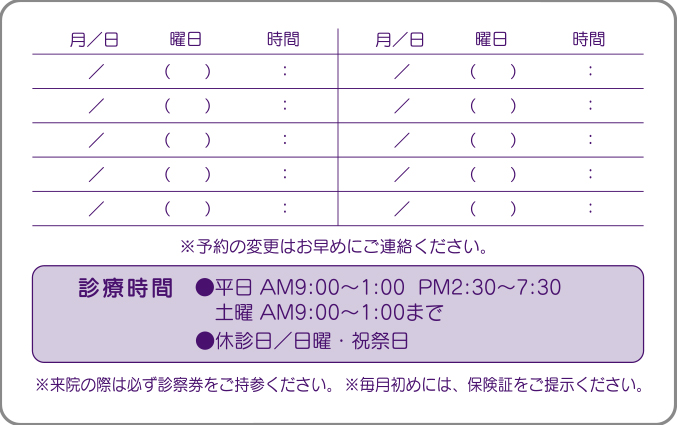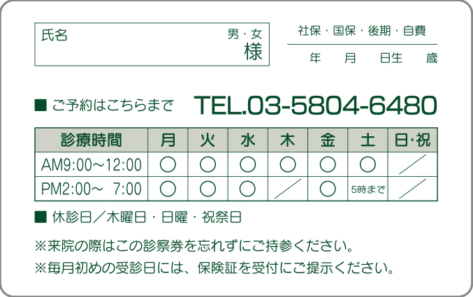 診察券裏面シール【オーダーメードタイプ】 040010 使用方法や医院様のイメージに応じて、サイズ・デザイン・印刷色など自由にご指定いただけます。 ◆ご注文方法 デザイン例を参考、またはご自由に希望内容をご指示ください。あわせて名入れ印刷色・サイズをご指示ください。 他にもデザインがございます、お問合せください。 注文数 4,000 6,000 レイアウト 選択してください 前回同様 サンプルA サンプルB サンプルC サンプルD サンプルE サンプルF その他 名入れ印刷色 選択してください 前回同様 クロ コン 濃グリーン アカ コゲ茶 濃グレー ブルー グリーン ムラサキ 在庫状態 : 在庫有り ¥30,250(税込) 只今お取扱い出来ません 数量