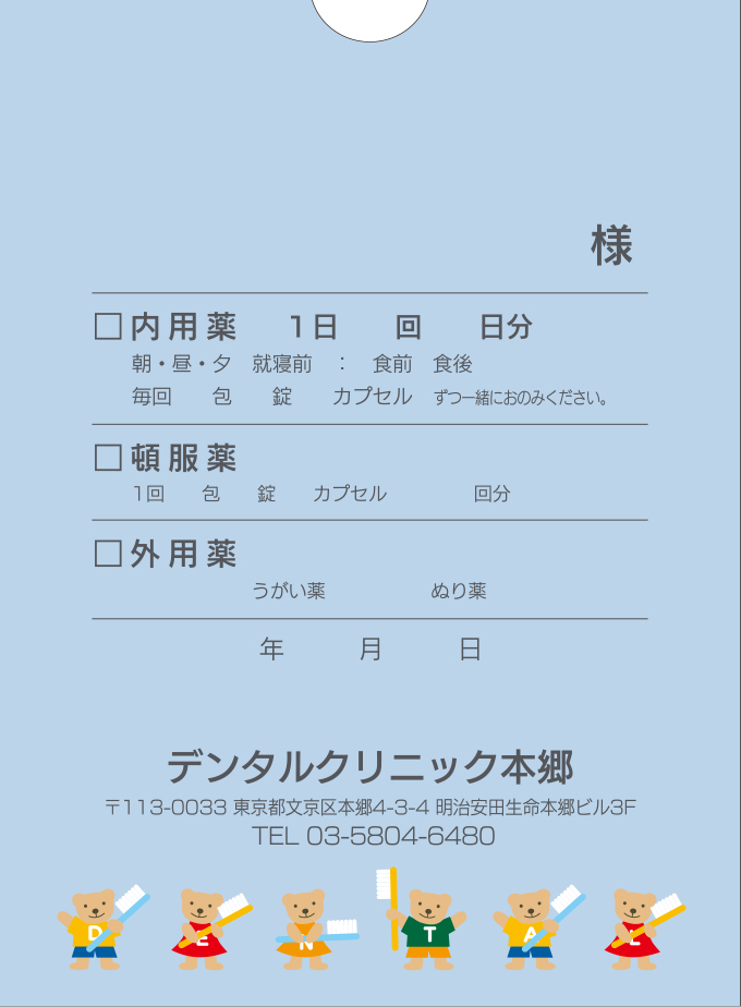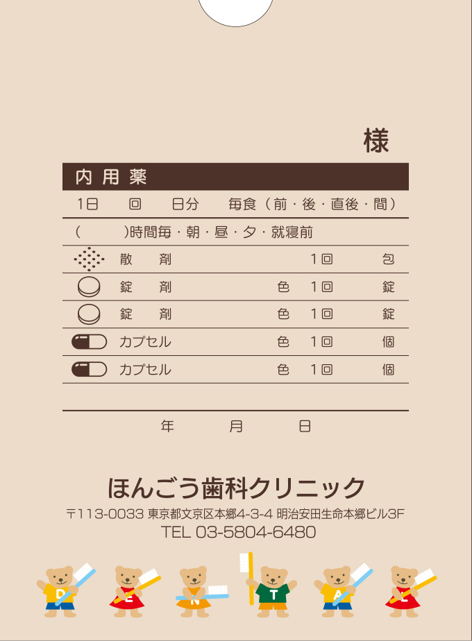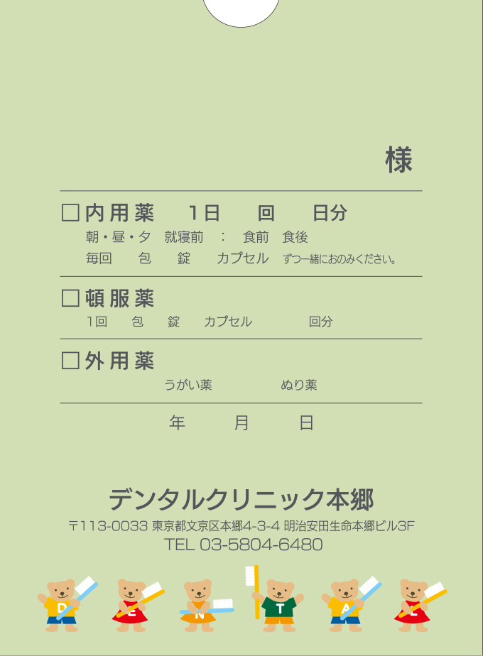 片面印刷ペーパー薬袋【デンタルベア】 010039 ◆ご注文方法 ご希望の枚数をお選びください。各柄の中から単品、もしくは各柄組み合わせて合計1,000枚より承ります。 印刷内容は掲載サンプルを参考に、または自由にご希望内容をご指示ください。あわせて名入れ印刷色をご指示ください。 注文数 1,000 2,000 4,000 ピンク ーー 250枚 500枚 1,000枚 1,500枚 2,000枚 2,500枚 3,000枚 3,500枚 4,000枚 ベージュ ーー 250枚 500枚 1,000枚 1,500枚 2,000枚 2,500枚 3,000枚 3,500枚 4,000枚 グリーン ーー 250枚 500枚 1,000枚 1,500枚 2,000枚 2,500枚 3,000枚 3,500枚 4,000枚 ブルー ーー 250枚 500枚 1,000枚 1,500枚 2,000枚 2,500枚 3,000枚 3,500枚 4,000枚 名入れレイアウト 選択してください 前回同様 L1 L2 L3 名入れ印刷色 選択してください 前回同様 クロ コン 濃グリーン アカ コゲ茶 濃グレー グレー ブルー グリーン ムラサキ その他ご要望 在庫状態 : 在庫有り ¥12,650(税込) 只今お取扱い出来ません 数量